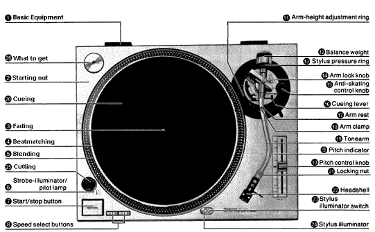 This is the main tool for any "respectable" DJ. It is the voice of the DJ, the hands of the DJ and source of the music. Vinyl records are placed on the main platter of the turntable and a needle arm (containing a needle) is placed on the records. This needle fits into the grooves of the records and reads the musical information stored there. Of course, DJs can use other methods for playing music...such as CDs or MP3s but to most DJs, there is a certain style, hands-on feeling or flare about mixing and spinning round pieces of vinyl.